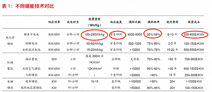 抽水儲(chǔ)能目前擁有其它儲(chǔ)能都無(wú)法比擬的優(yōu)勢(shì),一個(gè)是在于它的成本,全生命周期成本不到0.3元/kwh,大幅低于現(xiàn)有儲(chǔ)能技術(shù)。另一個(gè)就是在于儲(chǔ)能的規(guī)模和轉(zhuǎn)化效率,大規(guī)模抽水蓄能可以有效利用在電力調(diào)峰上面,轉(zhuǎn)換效率可以達(dá)到70%-80%。但問(wèn)題同樣存在,對(duì)選址環(huán)境、地形條件及水文環(huán)境要求較高,建設(shè)周期長(zhǎng)達(dá)3-5年,響應(yīng)速度基本在分鐘級(jí)別的水平。而電化學(xué)儲(chǔ)能搭載了電池、鉛酸電池,響應(yīng)速度達(dá)到百毫秒級(jí),更適合用在一次調(diào)頻上。相較其他儲(chǔ)能方式而言,電化學(xué)儲(chǔ)能擁有更高的能量密度和轉(zhuǎn)換效率,場(chǎng)景應(yīng)用、建設(shè)周期更為靈活,產(chǎn)業(yè)鏈配套更加成熟,增長(zhǎng)潛力較大。