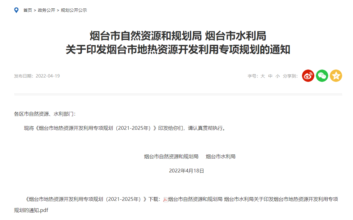 地大熱能地?zé)?多能互補(bǔ)新聞網(wǎng)訊:近日,煙臺市自然資源和規(guī)劃局、煙臺市水利局聯(lián)合印發(fā)了《煙臺市地?zé)豳Y源開發(fā)利用專項規(guī)劃(2021-2025年)》(以下簡稱《規(guī)劃》)。