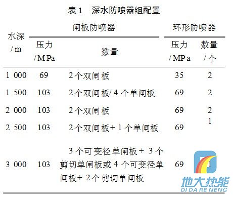 水下防噴器是海洋石油鉆采過程中用于防止井噴發生的專用設備,上部連接隔水管裝置,下部連接海底井口裝置。深水防噴器組通常有5個閘板和2個萬能防噴器組成,第5個閘板即底閘板可以剪斷套管,套管剪切閘板位于盲板的下部,以便在剪斷套管后可以關井,通常在套管可能遇卡或者鉆井裝置需要應急脫離時會用到。2個萬能防噴器是冗余設計的需要,上部萬能防噴器作為井控的主要手段。根據水深的不同,深水防噴器組通常有不同的配置。表1是在總結Transocean公司所有不同水深典型鉆井船防噴器組配置情況得出的,可以作為深水鉆井防噴器組配置的參考。 對于浮式鉆井裝置(半潛式平臺或鉆井船),選用防噴器系統的通徑為?476.3mm(工作水深<600m)或?425.5mm(工作水深>600m),選用封井壓力為69、103、138MPa時,視工作水深、海底至目的層深度和是否為特殊高壓的油氣層而定。為了適應欠平衡鉆井的需要,井口防噴器組合要配置高壓旋轉防噴器,即隨鉆壓力控制系統PCWD(Pres2sureControlWhileDrilling)。