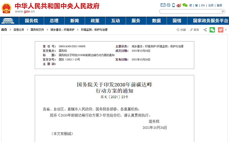 現將《2030年前碳達峰行動方案》印發給你們,請認真貫徹執行。