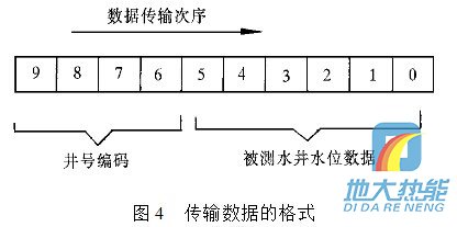 現(xiàn)在通過單片機輸出控制一組由三極管組成的電子開關,由電子開關代替按鍵功能完成數(shù)據(jù)輸入.例如:要傳輸十進制數(shù)據(jù)0,1,2,3,4,5,6,7,8,9,單片機依次輸出接通雙音頻編碼器輸入數(shù)字按鍵0,1,2,3,4,5,6,7,8,9對圖4 傳輸數(shù)據(jù)的格式應的電子開關的控制信號,則該組數(shù)據(jù)經(jīng)雙音多頻編碼器轉換為雙音頻信號. 雙音多頻編碼器在單片機控制下,定時“撥通”水位監(jiān)測中心電話號碼,在水位監(jiān)測中心計算機應答并“摘機”的情況下,通過這條已接通的電話線路,將所測的水位數(shù)據(jù),經(jīng) 過雙音多頻編碼器編碼后傳送到監(jiān)控中心. 要傳輸?shù)臄?shù)據(jù)格式為:數(shù)據(jù)長度為10位十進制數(shù),其中高四位為井號編碼,低六位為所測量的水井水位數(shù)據(jù),水位數(shù)據(jù)分整數(shù)和小數(shù)兩部分.數(shù)據(jù)傳輸?shù)姆较蚴菑母呶坏降孜?數(shù)據(jù)格式如圖4所示.