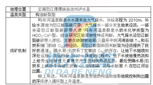 云南瑪布河溫泉風景云南旅游地怒江州地熱資源豐富,現已探明的有20多處溫泉。怒江峽谷福貢縣境內有勒阿建溫泉、子楞溫泉;云南旅游地怒江州瀘水縣境內有亞巴溫泉、古炭河溫泉、滴水河溫泉、登埂溫泉、瑪布河溫泉、蠻英溫泉、段家寨溫泉、老窩溫泉、中元澡塘溫泉等9個溫泉區。多數為硫磺礦泉,水溫大都在46℃以上,最高達80℃,具有較高的開發價值。